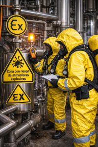 La formación aborda la prevención y control de atmósferas explosivas y atmósferas con contaminantes, enseñando cómo identificar zonas ATEX (atmosferas potencialmente explosivas), aplicar medidas de seguridad específicas y cumplir con la normativa vigente para estos entornos industriales de alto riesgo.
